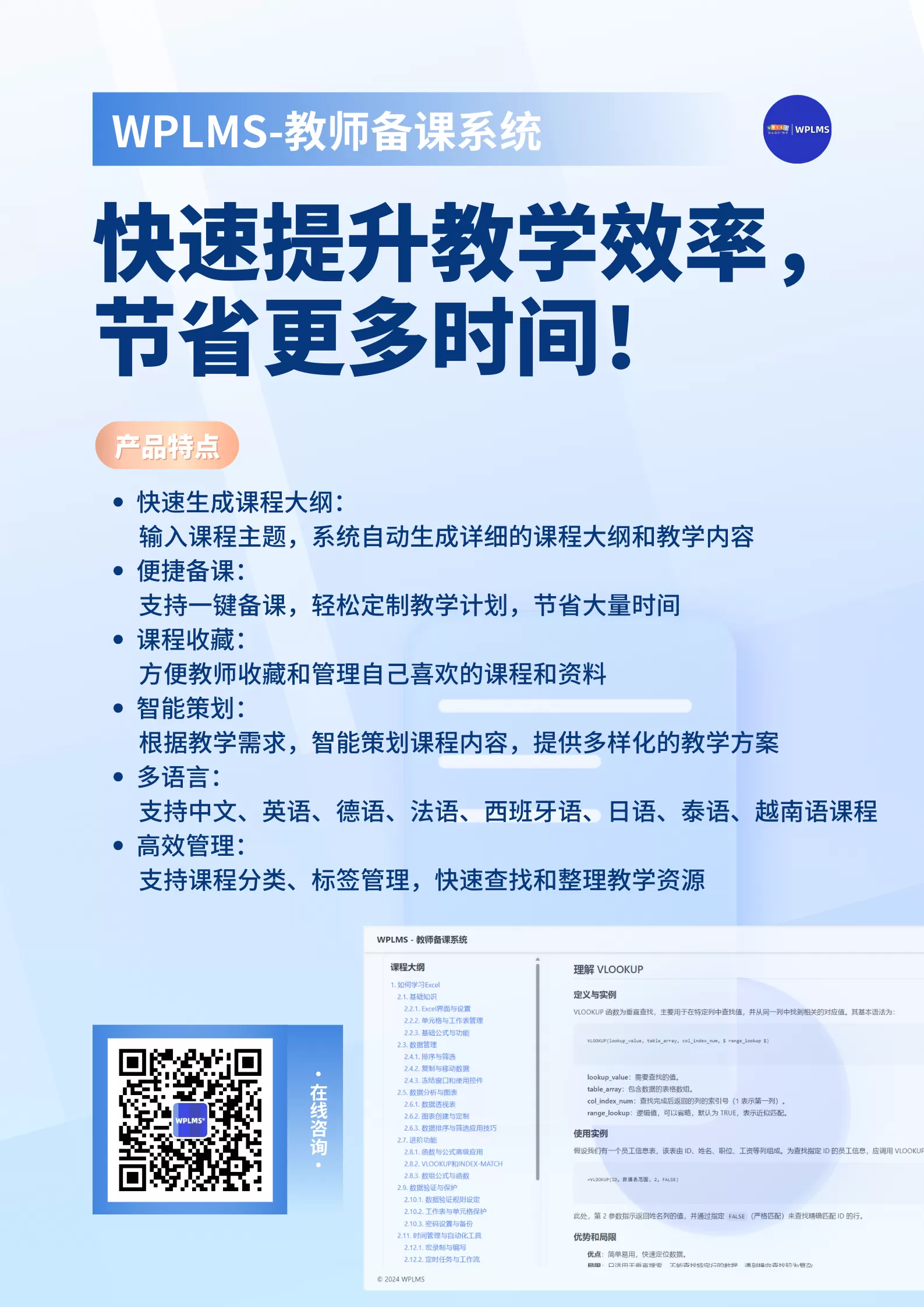 关键词:WPLMS在线教育学习系统、一键生成课程、教师备课、出书支持。