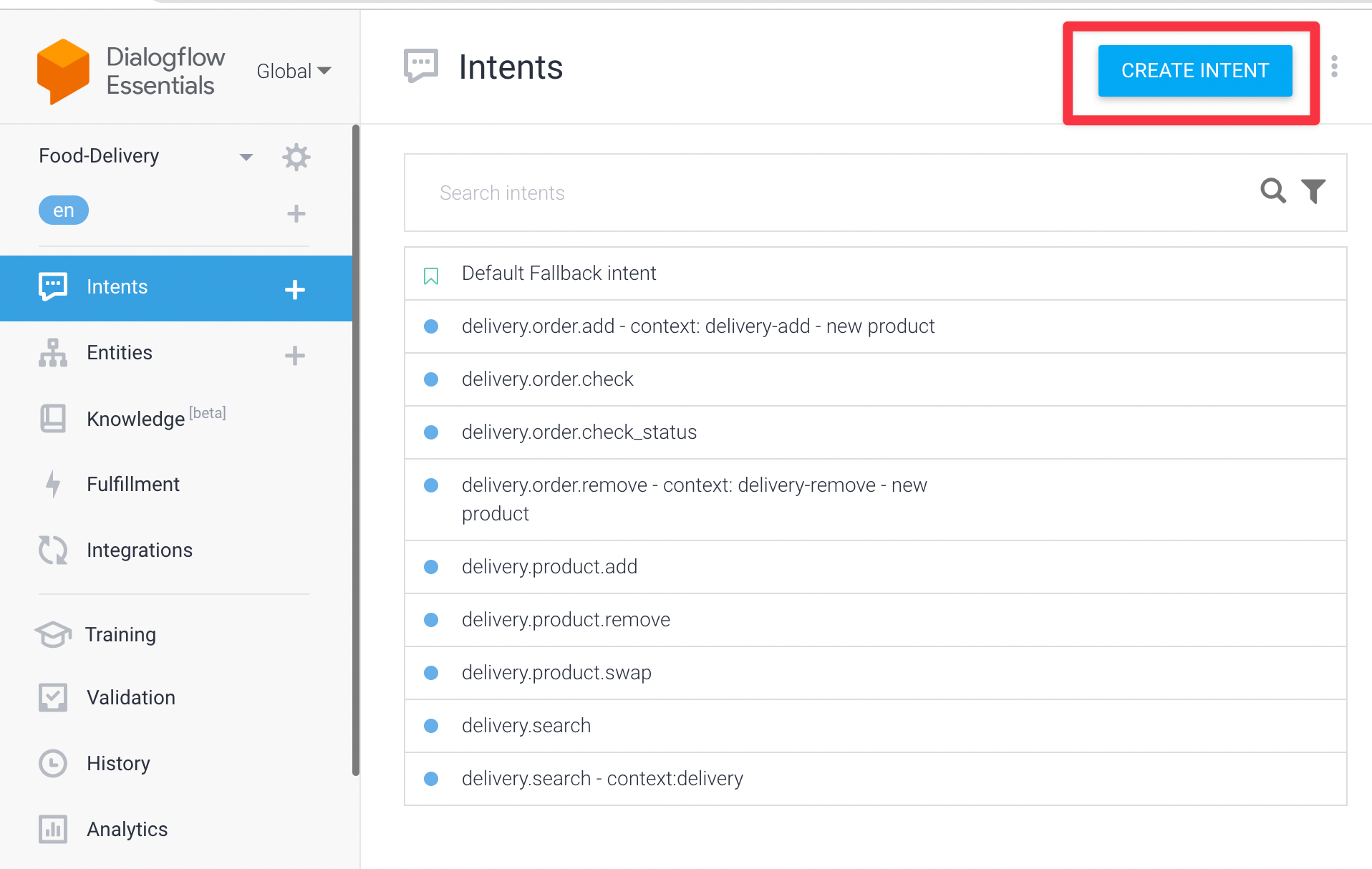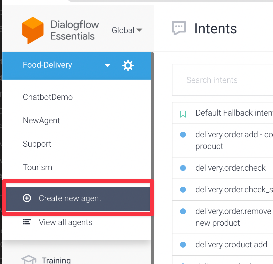 提示:您也可以从下面的 Google 预设代理之一开始https://dialogflow.cloud.google .com/#/agent/food-delivery-qewk/prebuiltAgents