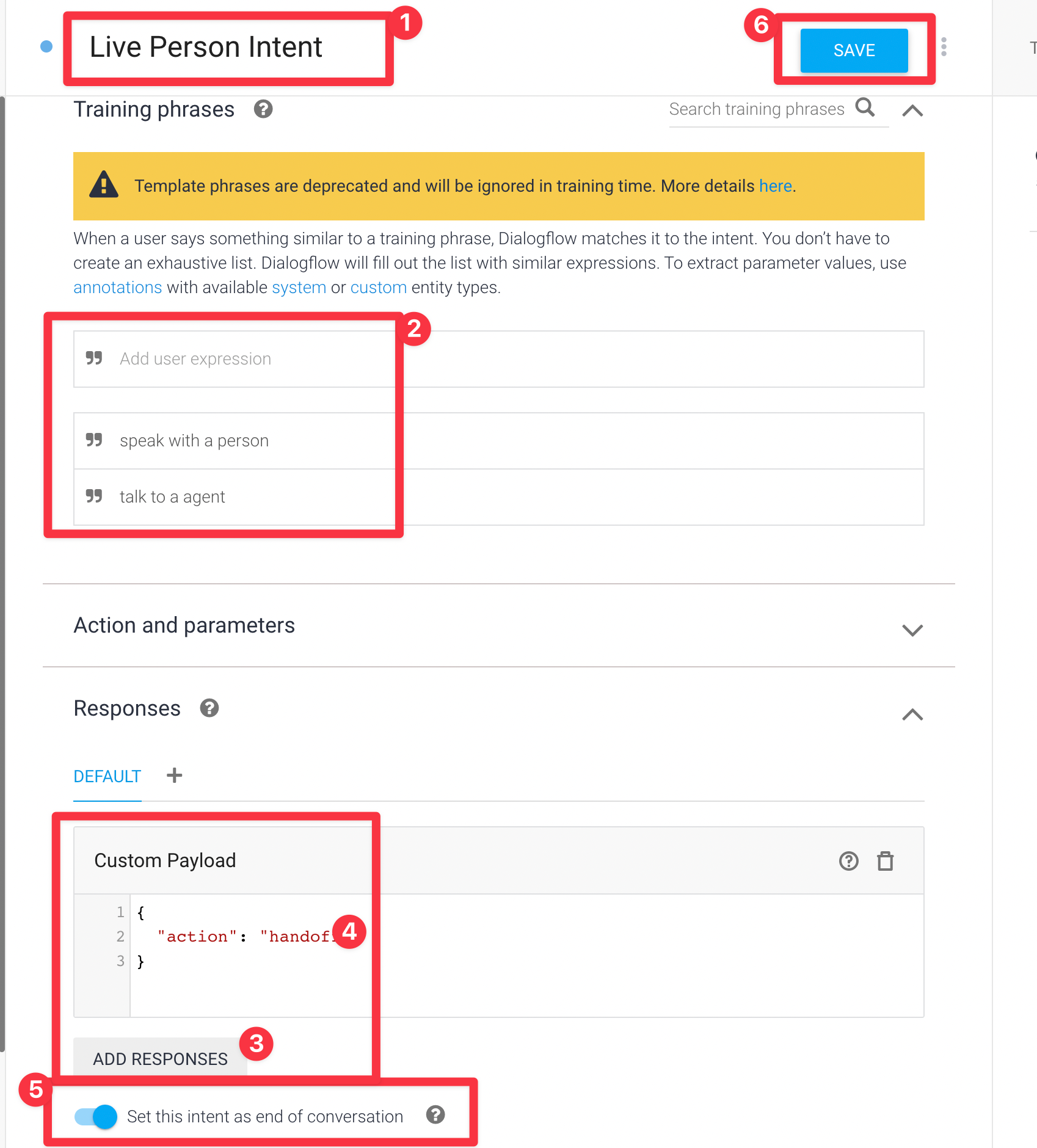 在此示例中,我们刚刚创建了一个“与人类对话”意图,它将对话传递给人类。 通常,您会在此处添加更多意图,以从常见问题解答机器人、订单接收机器人等创建多种类型的机器人