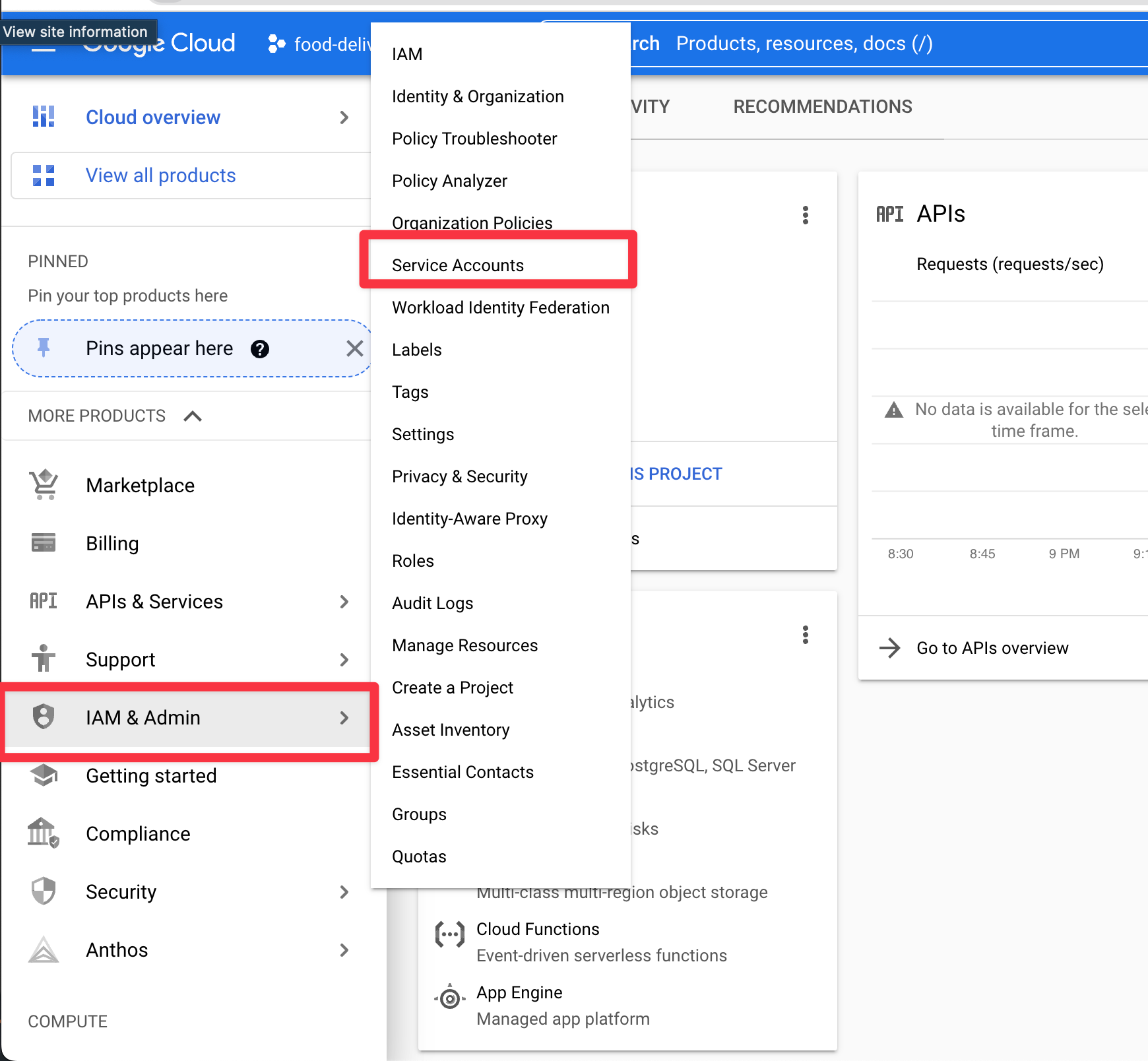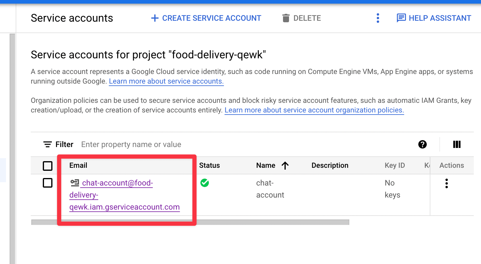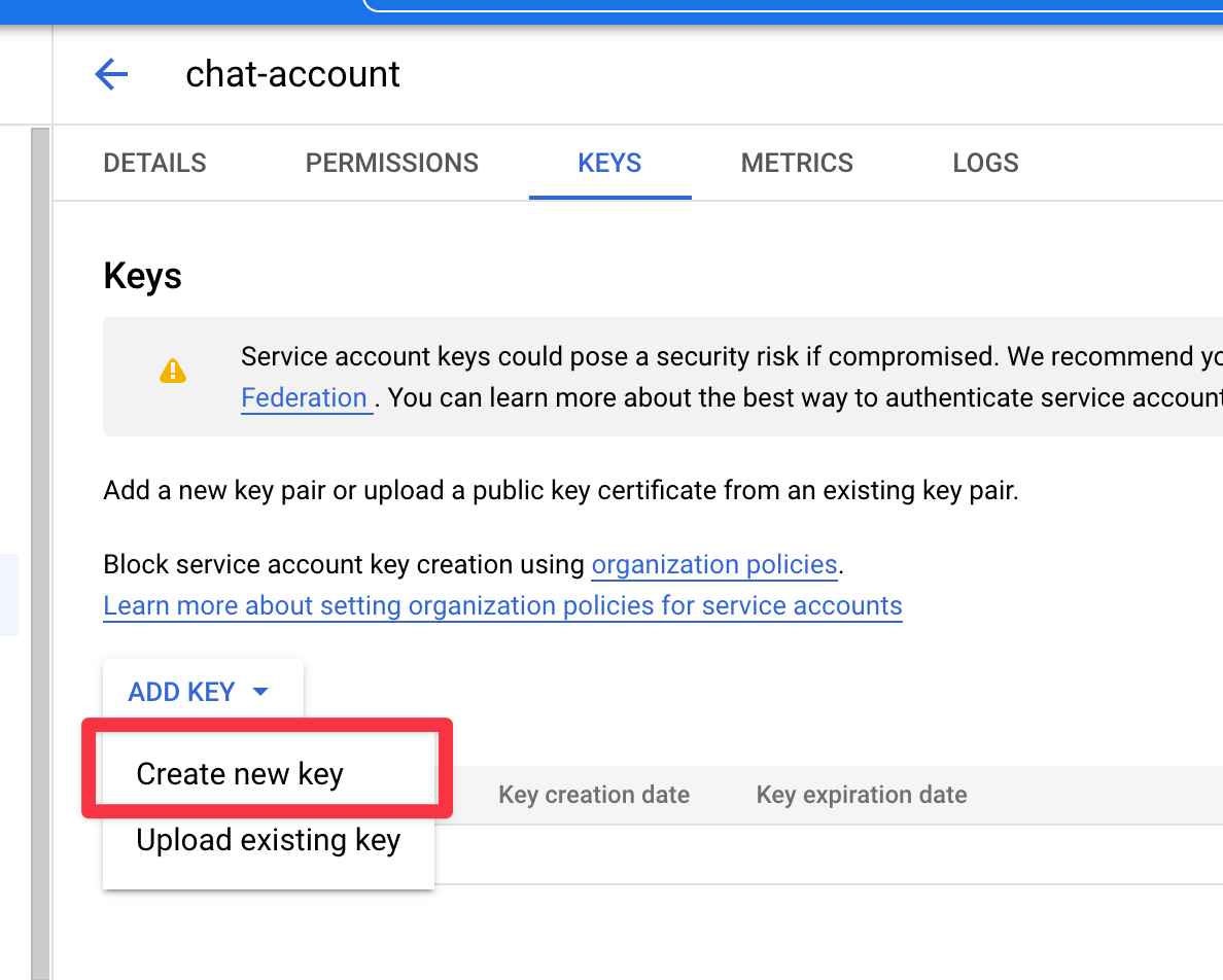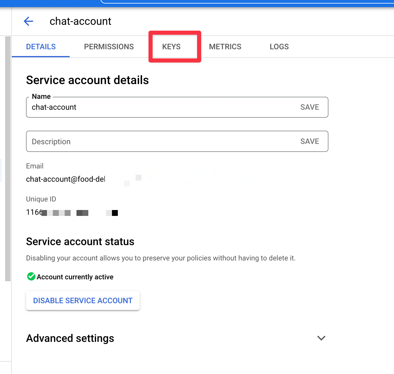 为了让聊天系统连接到您的新 Google 服务帐户,我们需要生成访问密钥。 在您的新服务帐户https://console.cloud.google.com/home/dashboard 中,您需要为新的服务账户进行设置