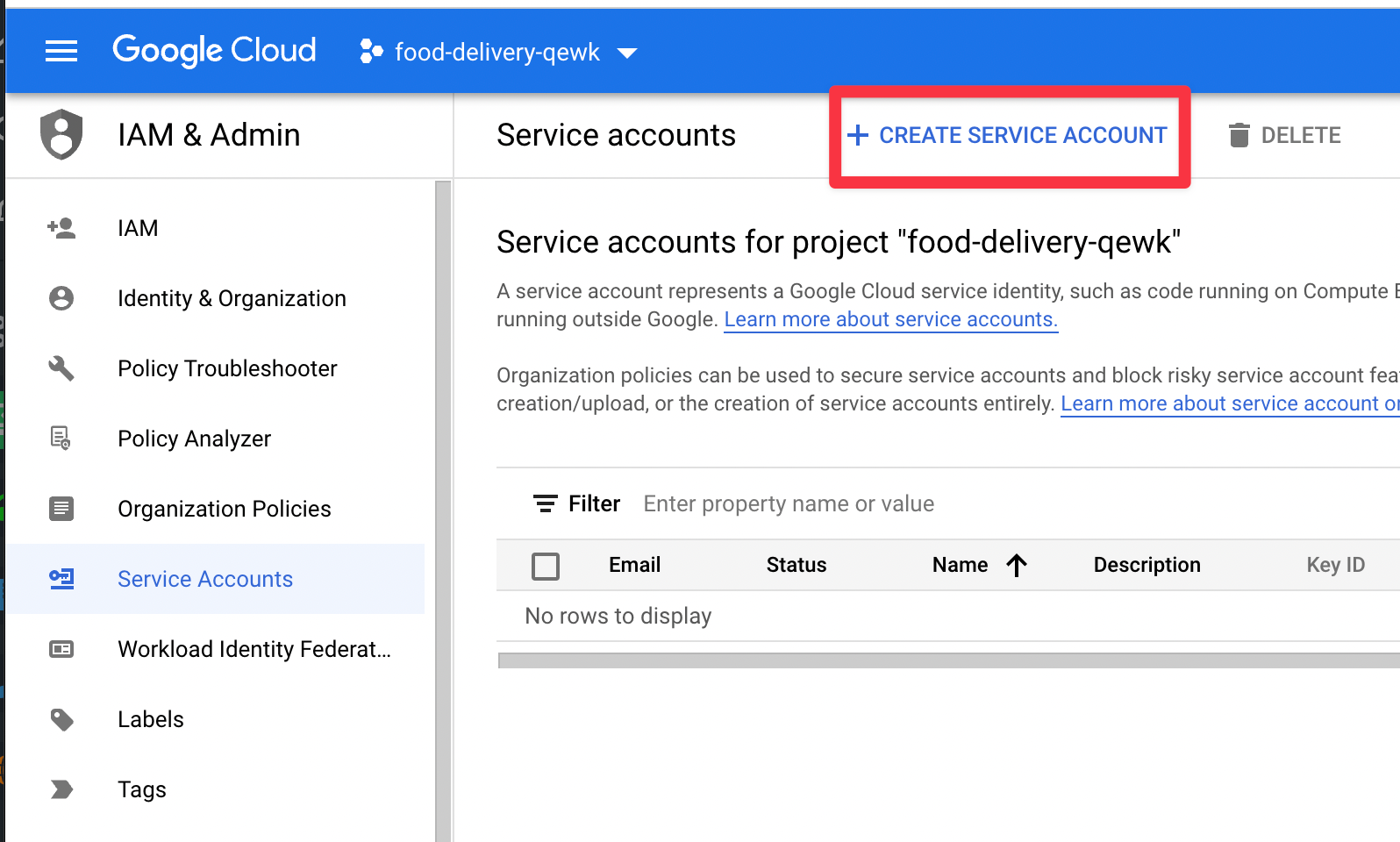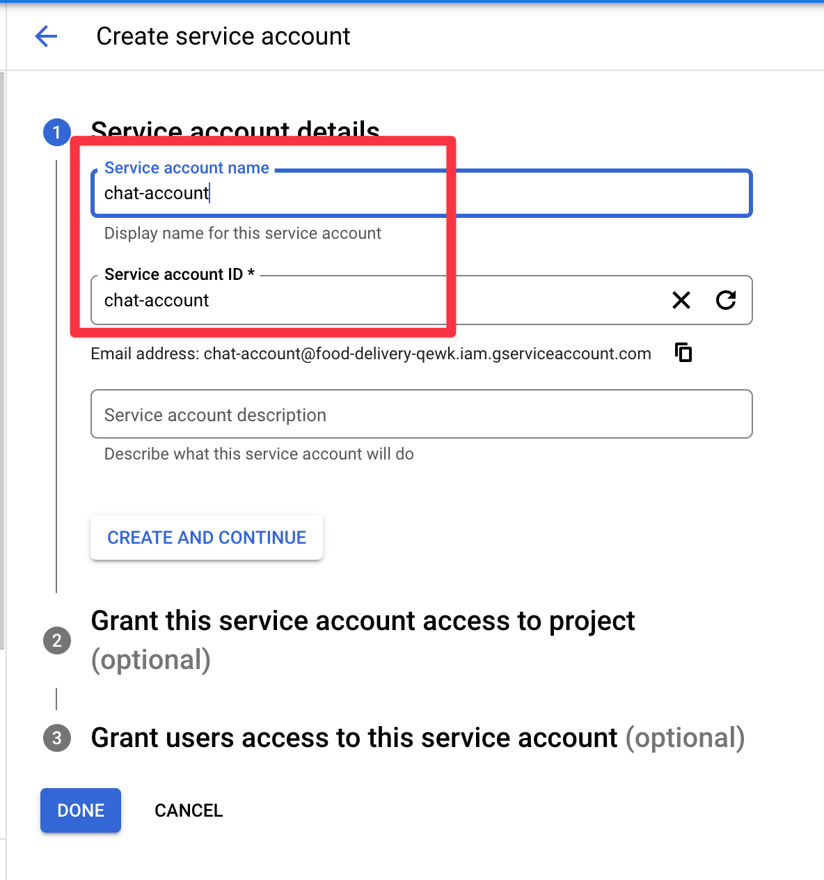 命名您的服务帐户并给它一个 ID(您可以将其命名为任何名称)
