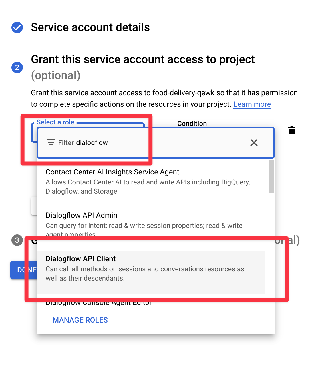 现在为此服务帐户选择“DialogFlow API 客户端”的角色