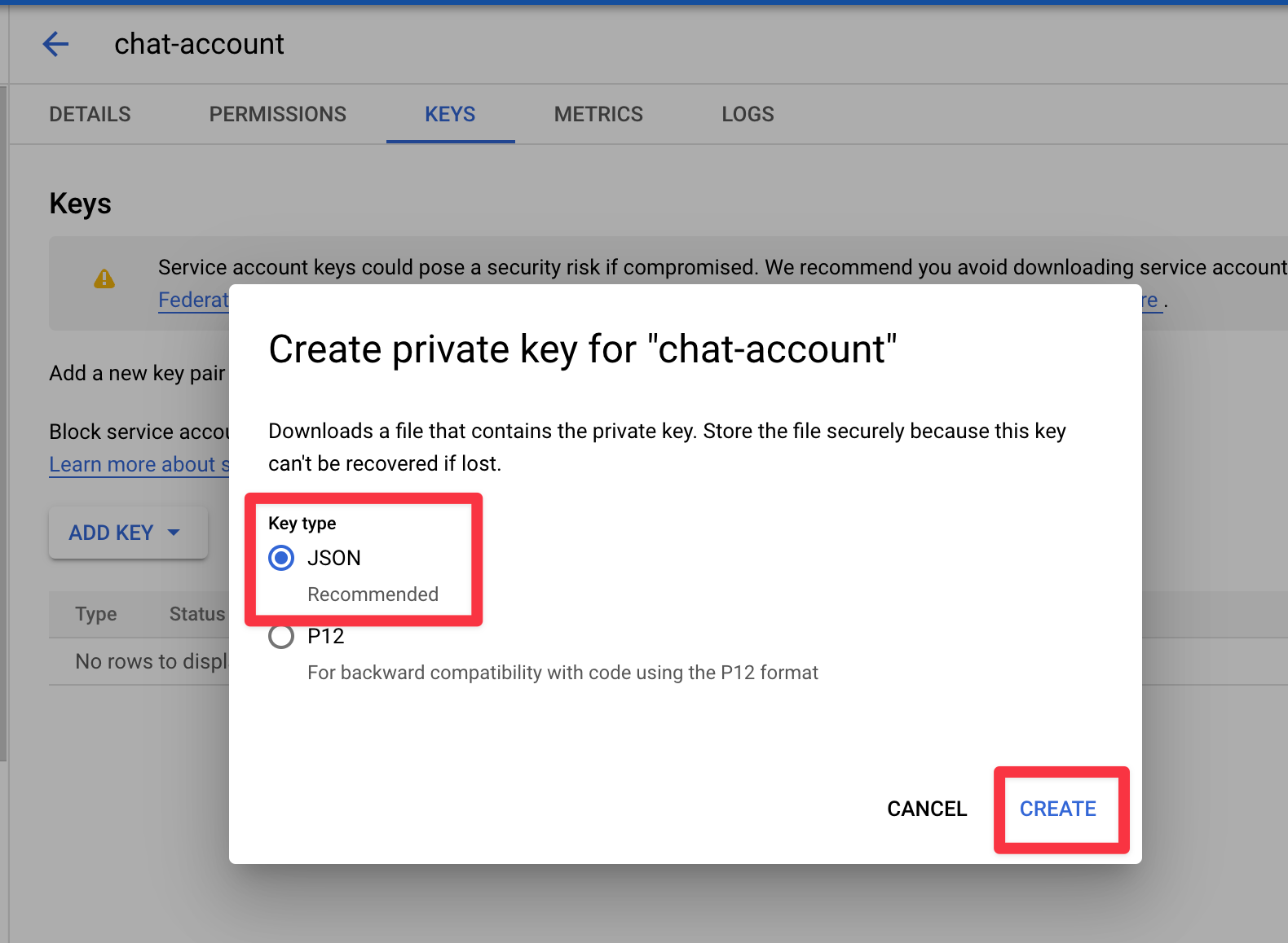 在下一个弹出窗口中,您将确保选择“JSON”选项,然后单击“创建”