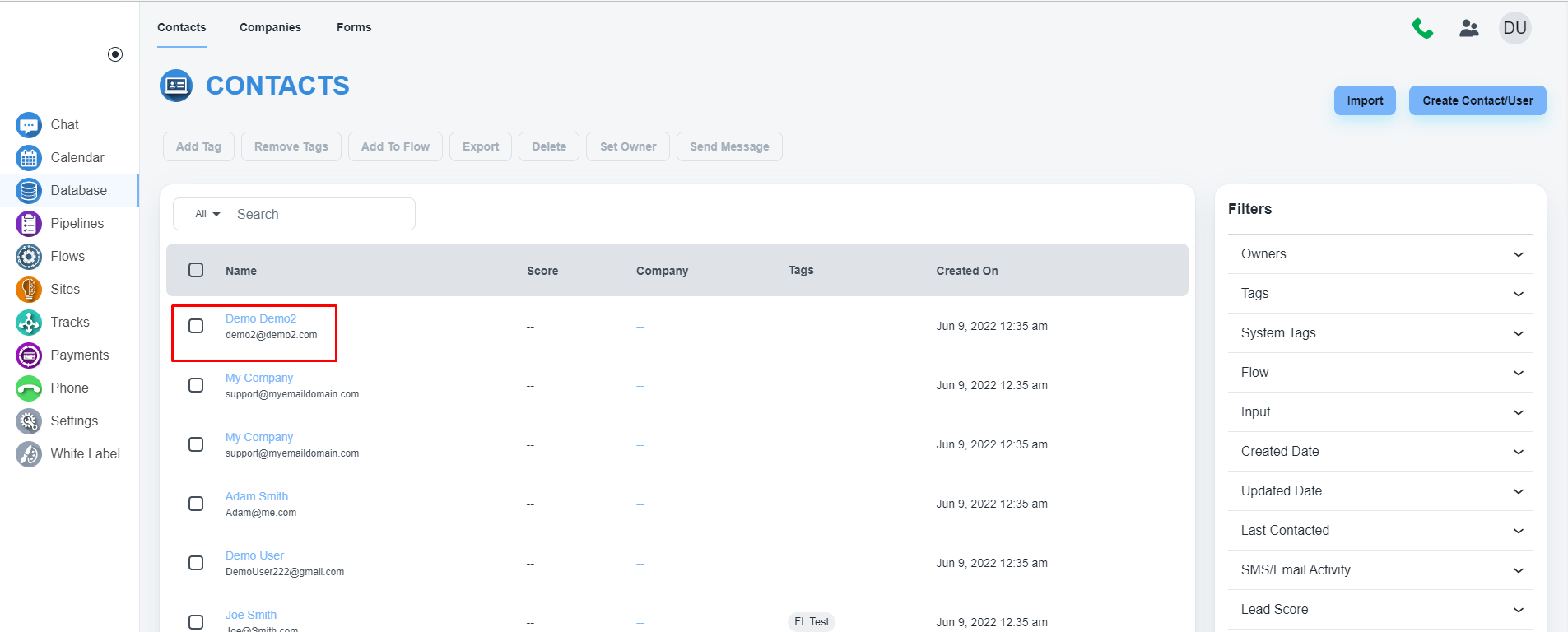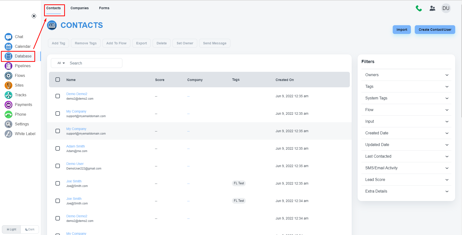 请导航到左侧菜单上的“数据库”。 页面打开后,请点击顶部菜单上的“联系人”。