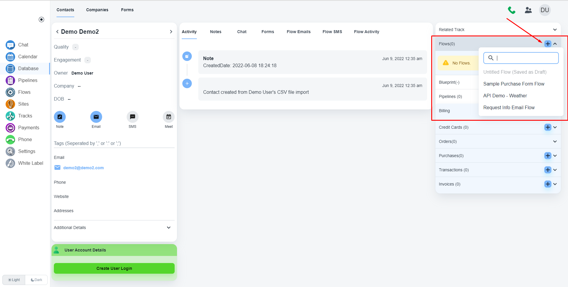 在右侧,可以选择将联系人添加到流程中。 请点击“加号”图标查看现有流程。