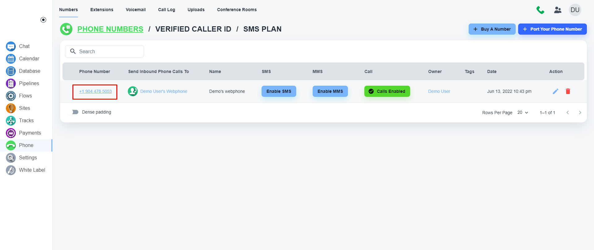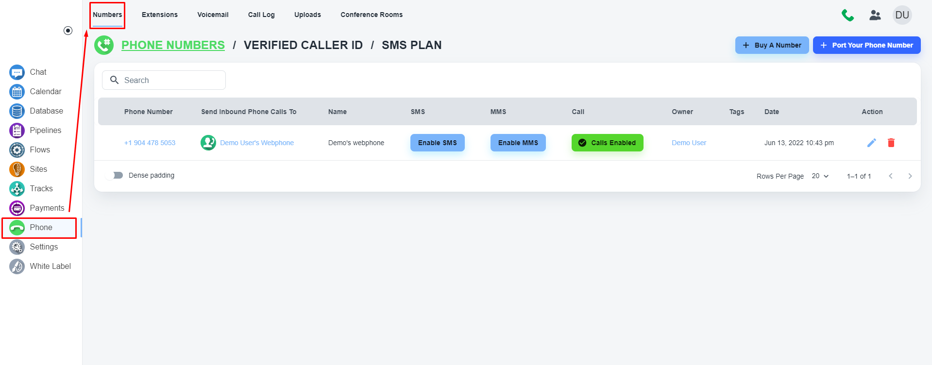 请点击左侧菜单中的“电话”浏览电话号码部分。 打开页面后,单击顶部菜单上的“数字”按钮。