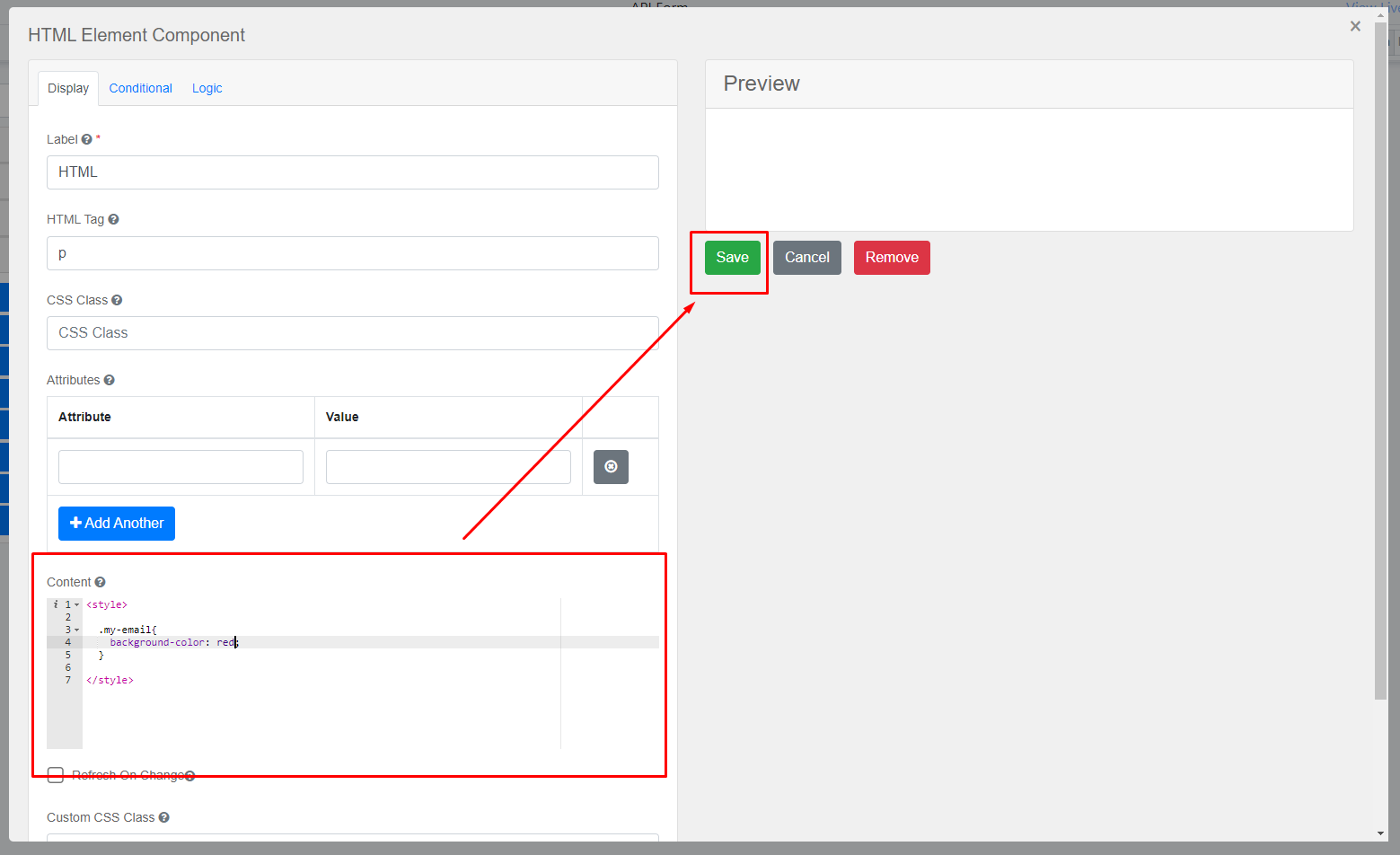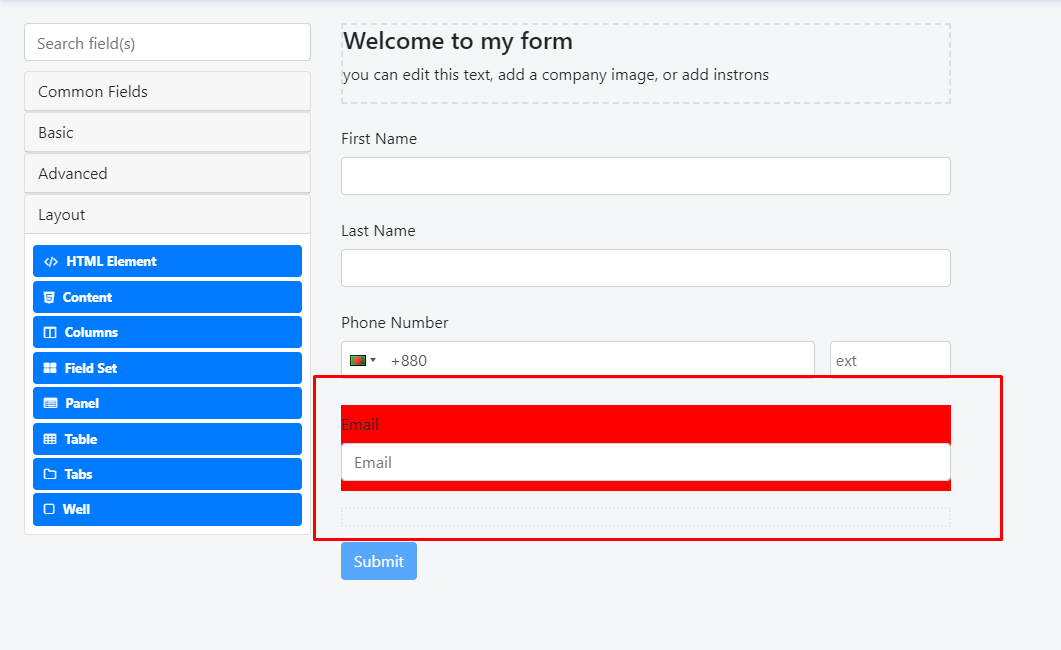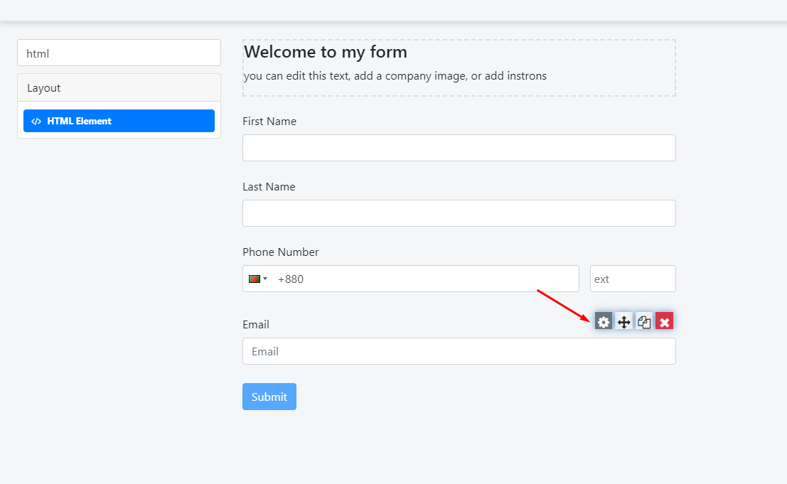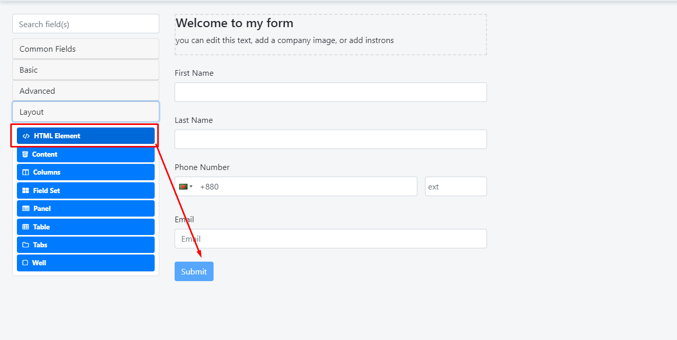 在“布局”部分下,我们有“HTML 元素”。 请将该元素拖到表单中