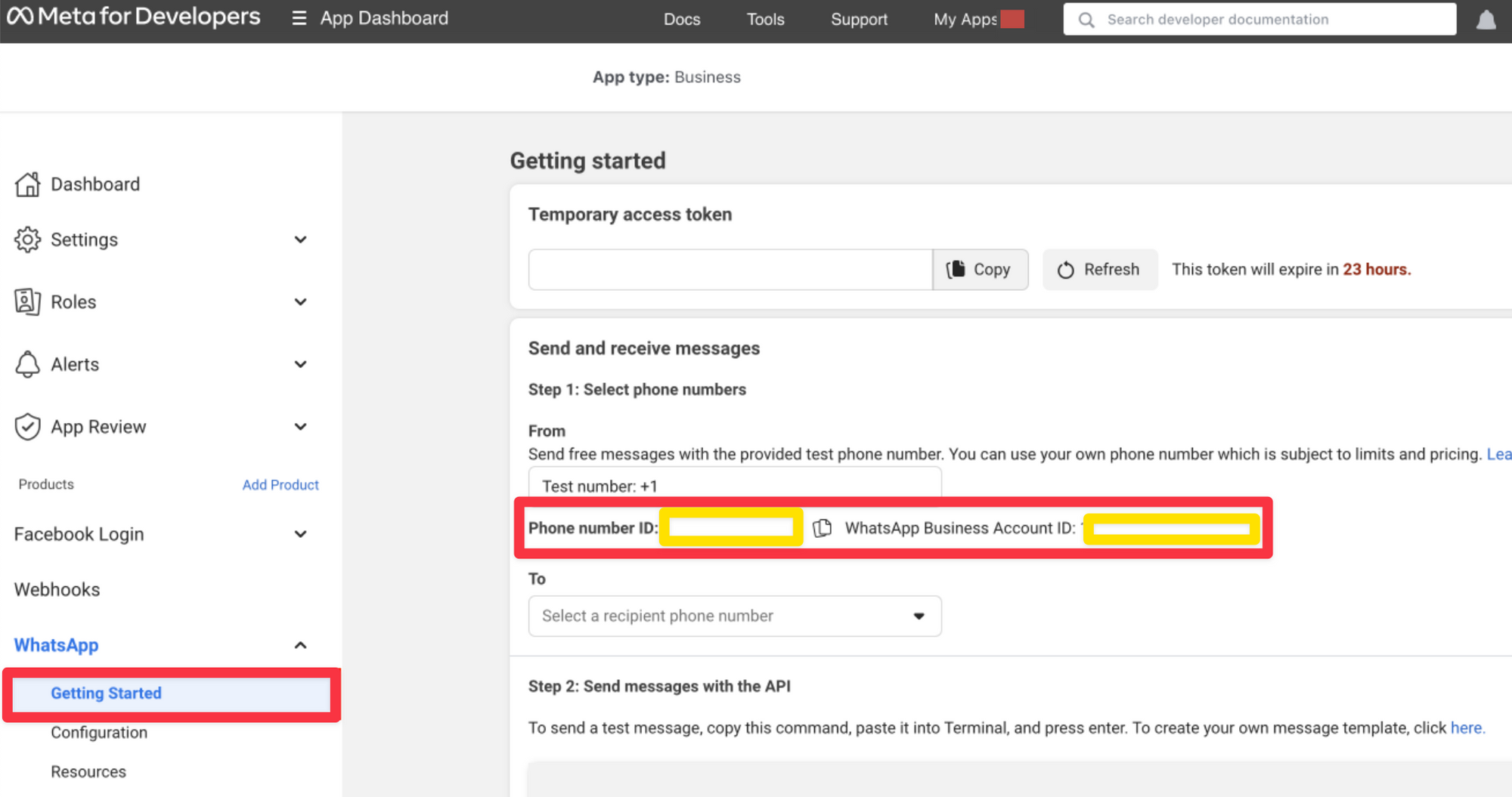 首先,您需要在此处: https://developers. facebook.com/docs/whatsapp/cloud-api/get-started ,参考“Set up Developer Assets and Platform Access” 的步骤,创建一个启用了 WhatsApp product 的 Facebook 开发者应用程序.