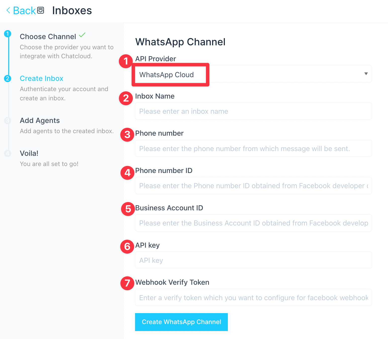 1. API Provider = 确保您选择了“WhatsApp Cloud” 2. 收件箱名称 = 为您的新收件箱取一个名称,例如“我的业务 WhatsApp” 3. 电话号码 = 输入您在 Meta Developer App 中配置的电话号码 4. 电话号码 ID = 输入您在本指南前面创建的电话号码 ID 5. 企业帐户 ID = 输入您在本指南前面创建的企业帐户 ID 6. API Key = 这是您创建的系统用户的访问令牌,可以访问您的Meta业务帐户 7. Webhook 验证令牌 = 在这里您需要输入一个 12-24 字符的长代码。 (保存以在下一步使用)