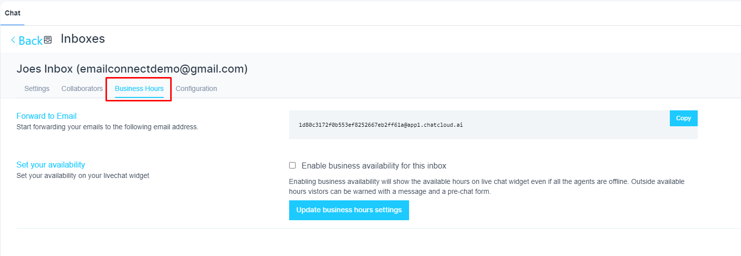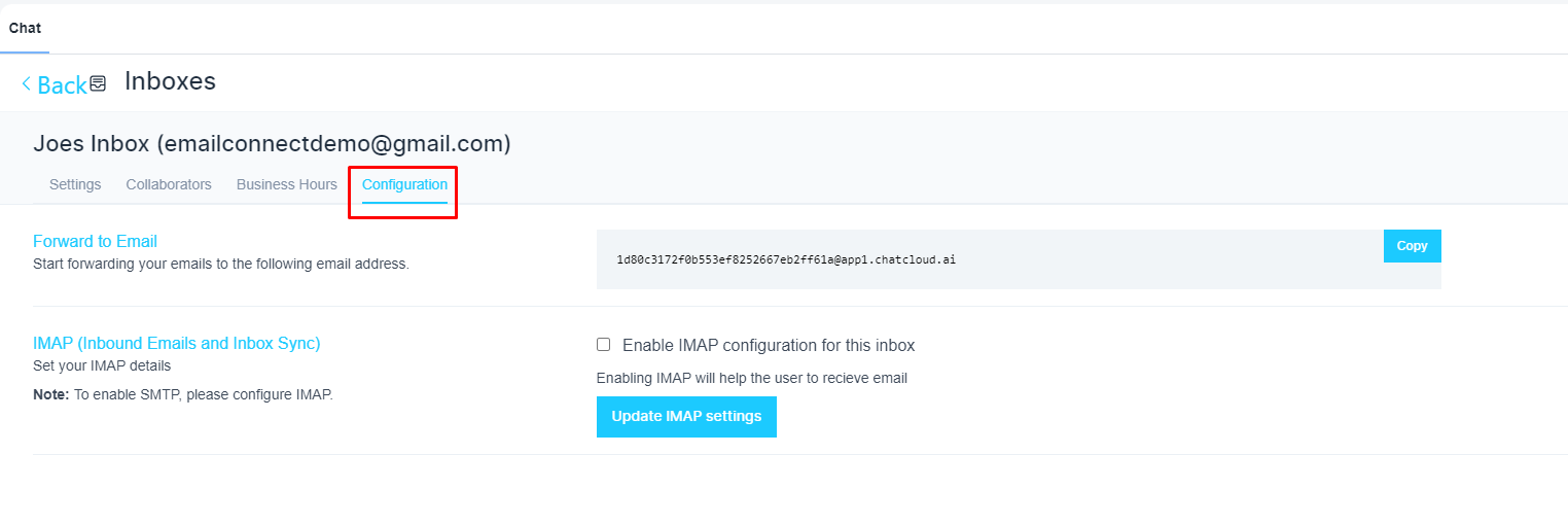 在配置选项卡下,您将看到接收入站电子邮件的转发电子邮件地址。 此外,您可以在此处配置 IMAP 和 SMTP 详细信息。