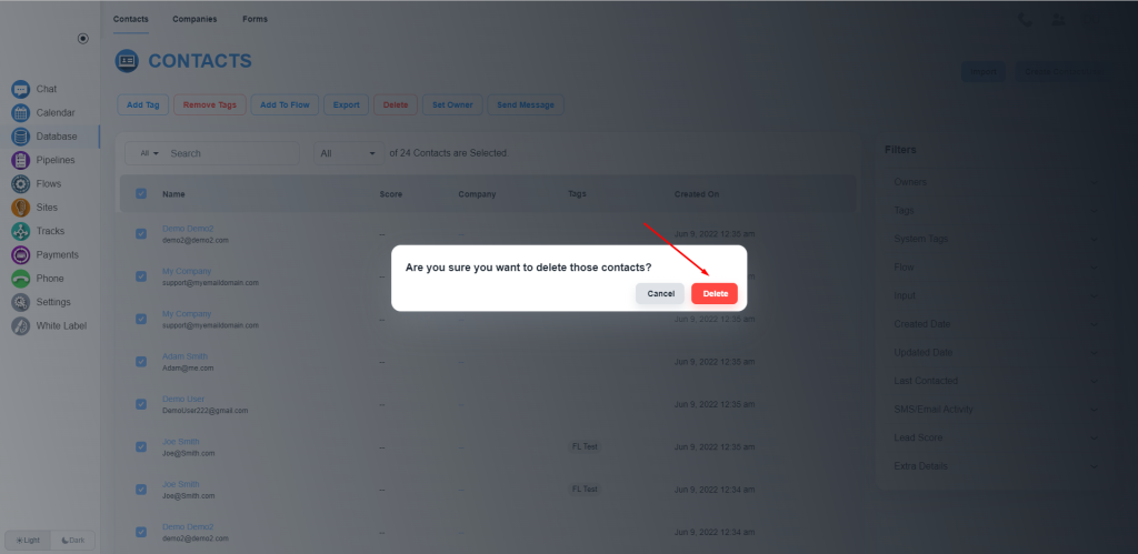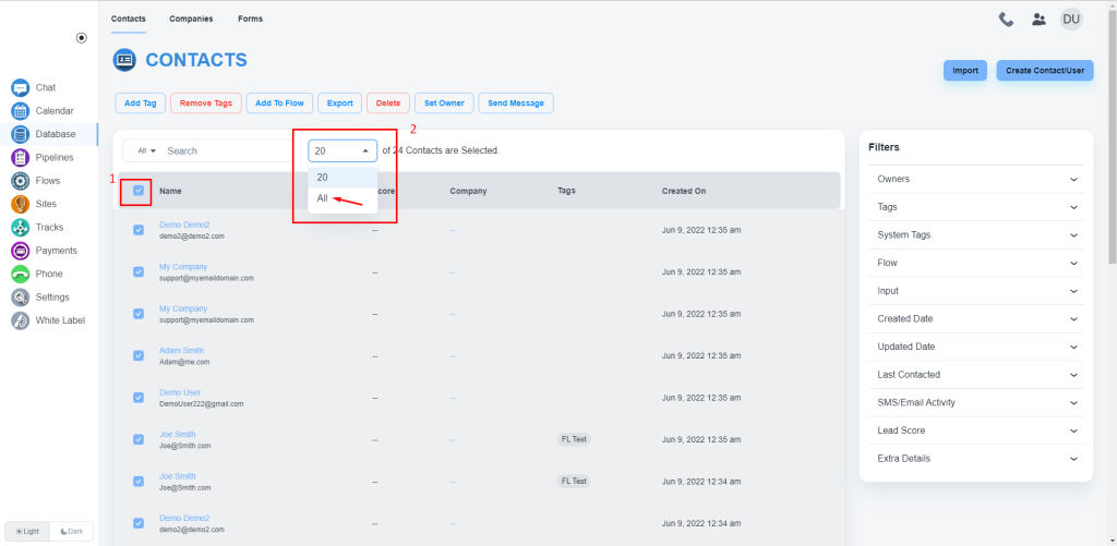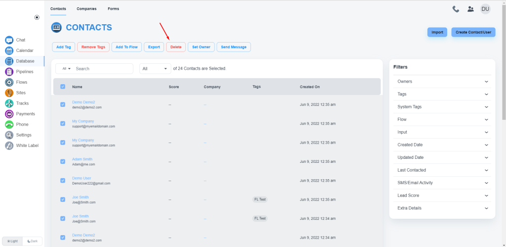 如何删除所有联系人?2022年09月16日删除所有联系人的步骤1、打开联系人列表请导航到左边菜单上的“数据库”。您将得到所有联系人的列表2、选择所有联系人请选中复选框以选中所有联系人。单击复选框后,系统将允许您下拉选择“全部”选项。3、删除联系人选中所有联系人后,点击“删除”按钮删除所有联系人请确认删除。