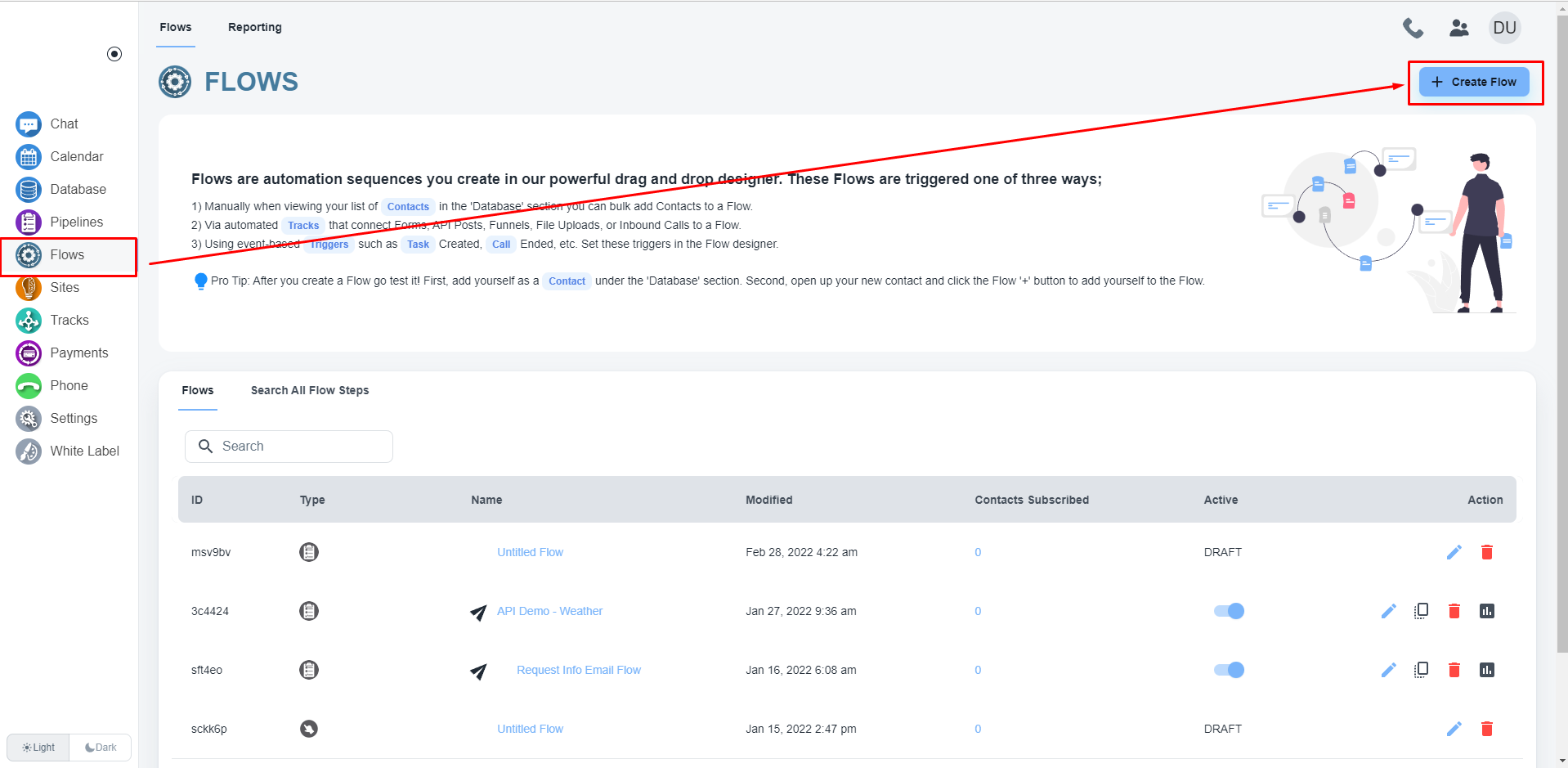 通过单击左侧菜单上的“流程”导航到流程构建器。 然后,当您打开流程页面时,您会在页面顶部看到“流程”的链接,请单击该链接。 单击“创建流程”按钮。