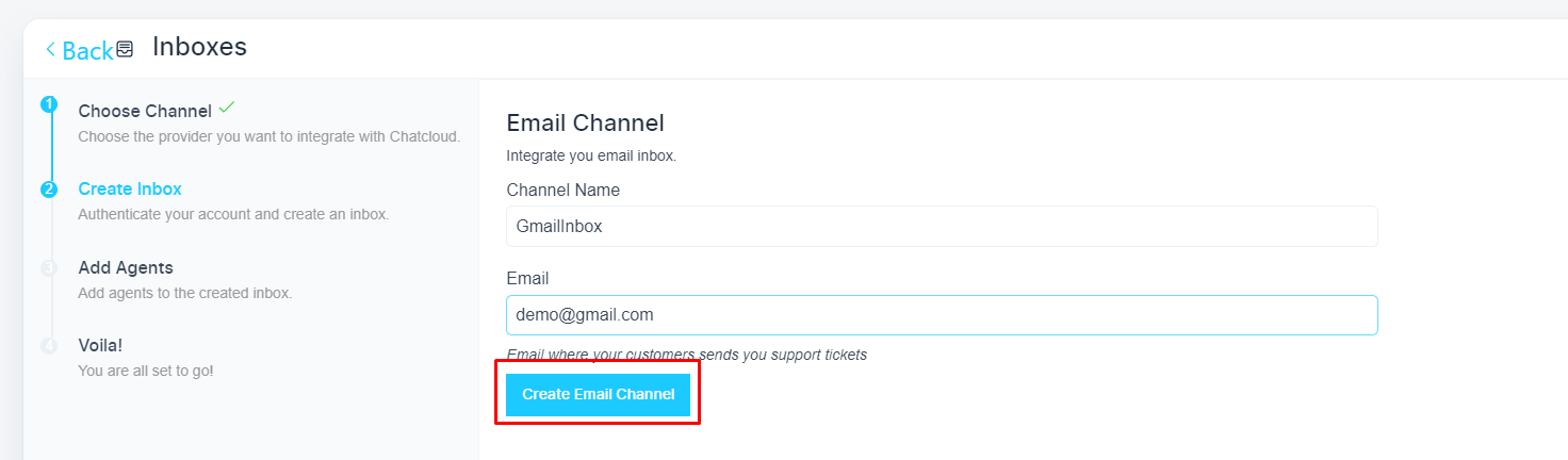 请点击“创建电子邮件频道”按钮。