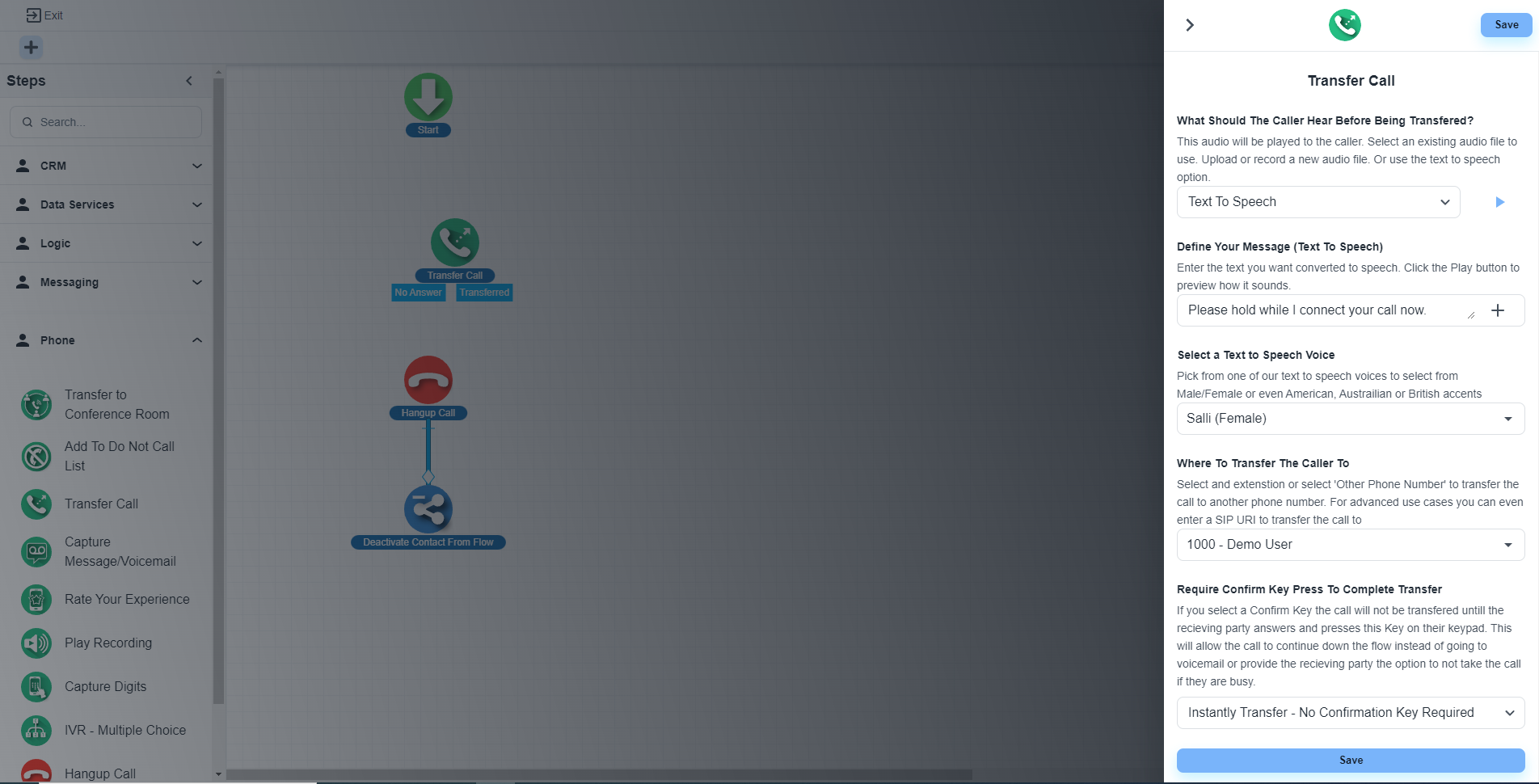 呼叫转移后,如果您不需要任何其他步骤,只需将该选项连接到“挂断呼叫”步骤即可。