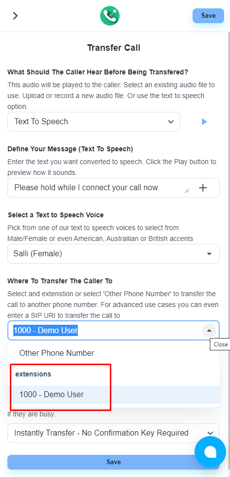 现在,我们有两个用于转接呼叫步骤的选项