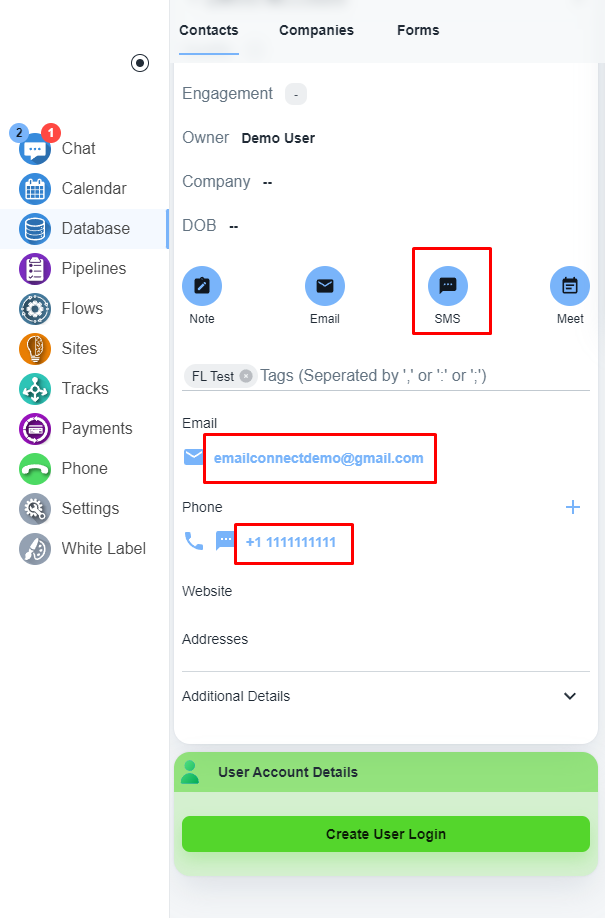 如何向单个客户发送短信/电话/电子邮件?2022年09月24日向单个客户发送短信/电话/电子邮件的步骤打开联系人请导航到左侧菜单栏上的“仪表板”并打开联系人发送短信/电子邮件/电话在左侧,您可以选择发送短信、电子邮件和电话如果您将鼠标悬停在电话号码上,您将可以选择拨打该号码我们还有专门的 SMS 和电子邮件发送按钮