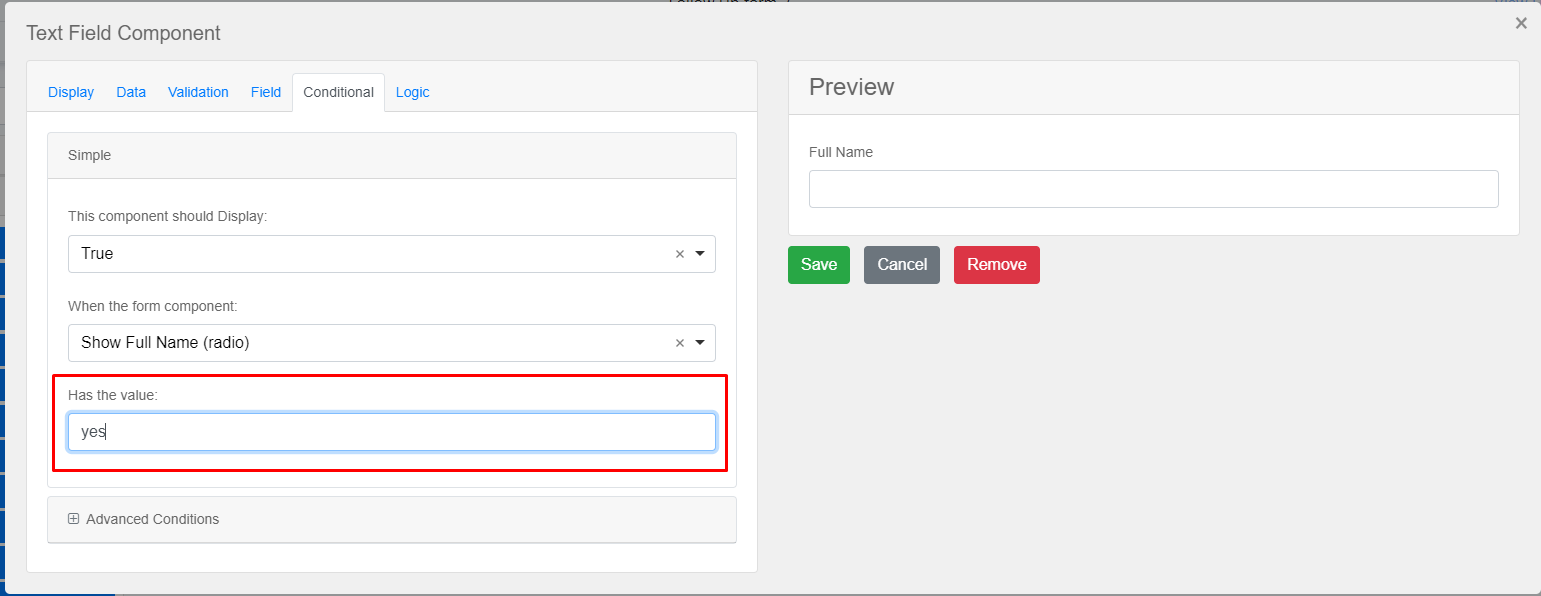 例如,我们有一个表单。 我们要根据之前单选字段“显示全名”的值,确实是否显示“全名”字段。