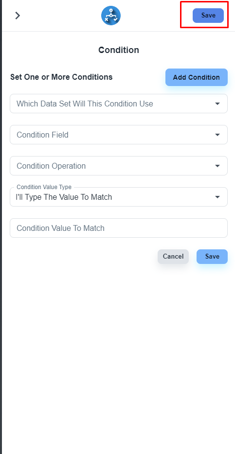 请选择第一个下拉菜单“此条件将使用哪个数据集”。 在最底部,您将获得与流程相连的表格。