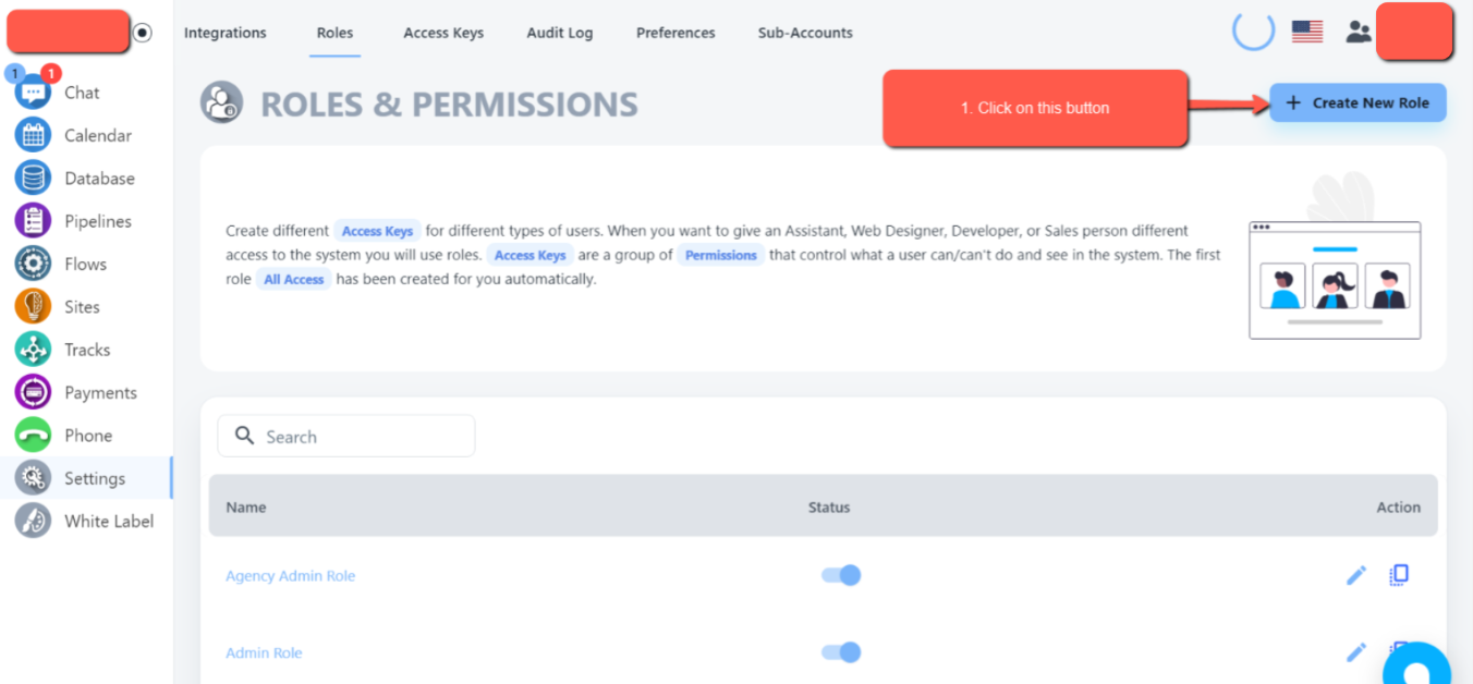 “Access Keys”是一组“Permissions”,用于控制用户可以/不能做什么,以及在系统中查看的内容。 第一个角色 “All Access”*已自动创建。